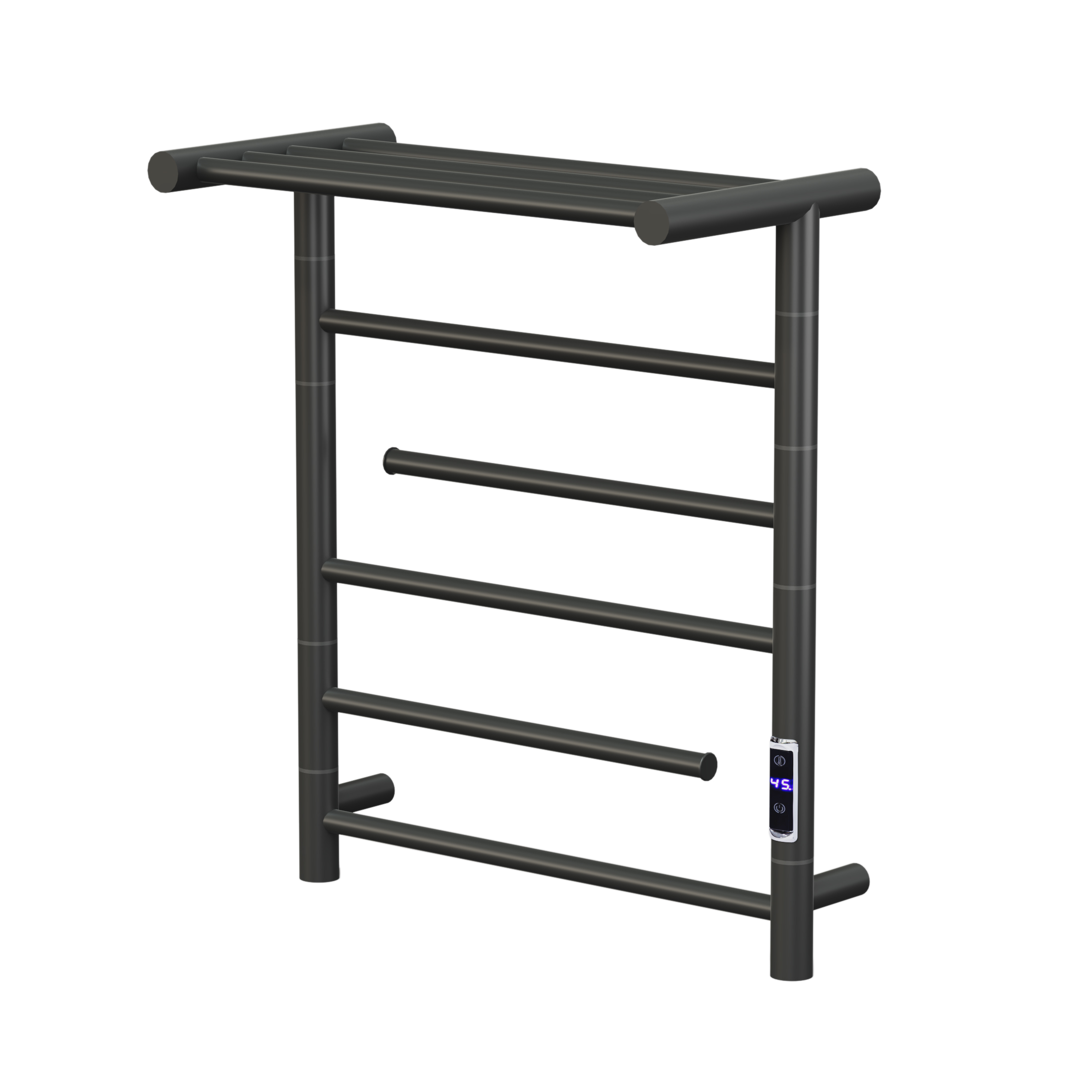 9桿時(shí)控溫控開關(guān)電熱毛巾架 9 bar time and temperature switch heat ed towel rail 材質(zhì)Material:SS201/SS304 功率Power:220V/140W 表面Surface:Black Painted 黑色噴塑 尺寸Size:565*320*675mm 包裝Ctn size:585*270*705mm