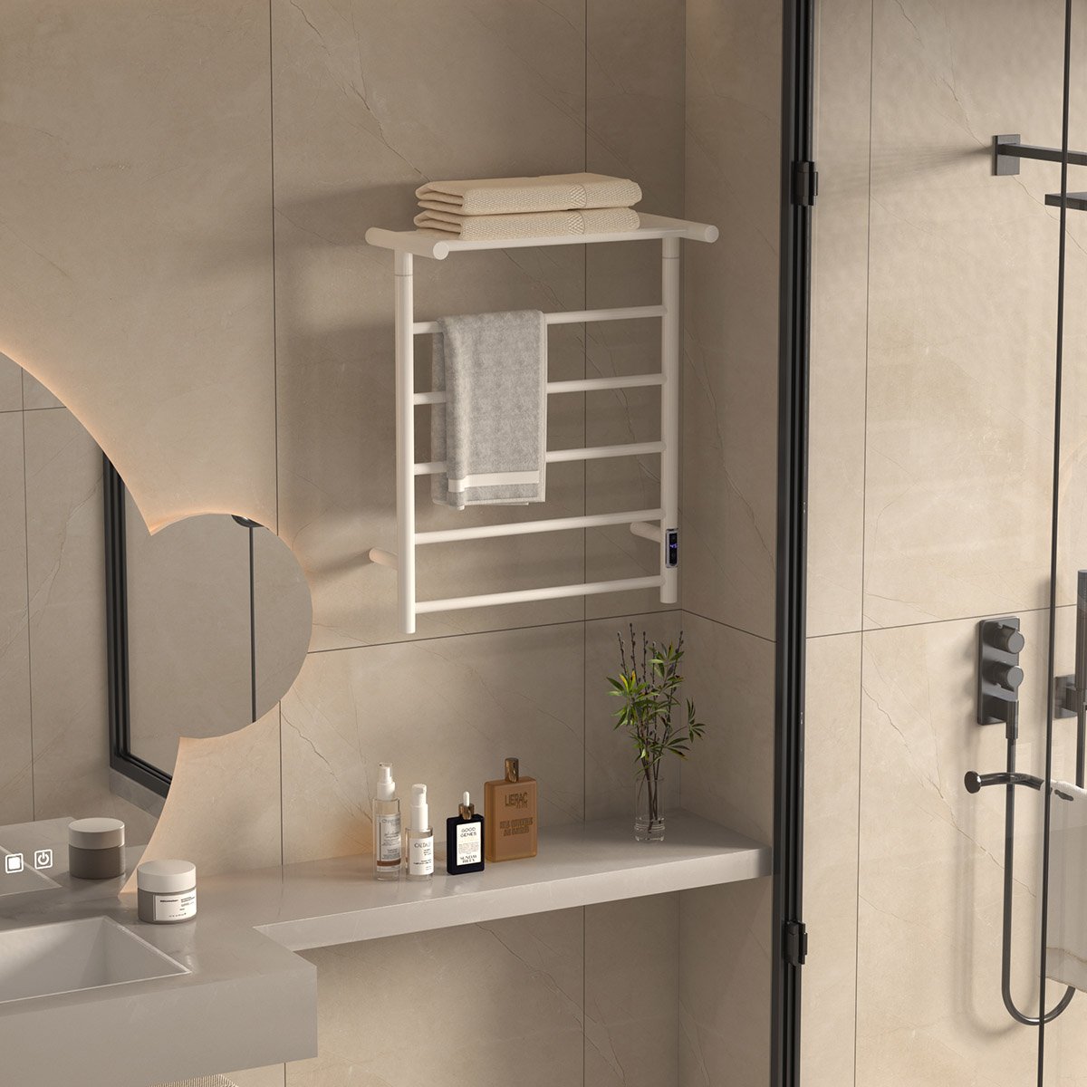 9桿時控開關(guān)電熱毛巾架 9 bar time switch heated towel rail 材質(zhì)Material:SS201/SS304 功率Power:220V/140W 表面Surface:White Painted 白色噴塑 尺寸Size:550*250*680mm 包裝Ctn size:570*270*710mm