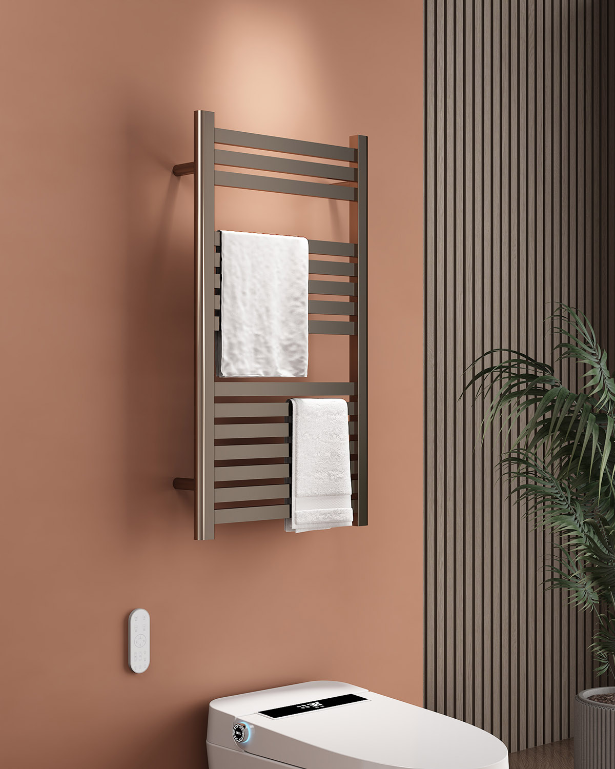 15桿電熱毛巾架 15 bar heated towel rail 材質(zhì)Material:SS201/SS304 功率Power:220V/175W 表面Surface:PVD Gun Black PVD槍黑 尺寸Size:500*110*900mm 包裝Ctn size:520*60*930mm