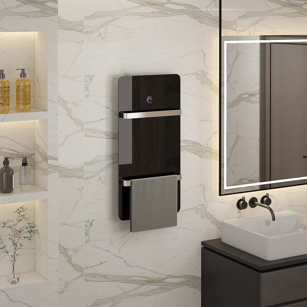板式液顯多功能開關(guān)電熱毛巾架 Panel LCD display multifunction switch heated towel rail 材質(zhì)Material:Glass 玻璃 功率Power:220V/140W 表面Surface:Black 黑色 尺寸Size:400*130*800mm 包裝Ctn size:440*150*860mm