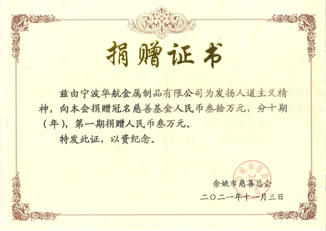 2021年11月3日,寧波華航金屬制品有限公司為了幫助扶貧濟困支持慈善事業(yè),華航公司向余姚市市慈善總會捐贈30萬元,并在余姚市慈善總會設立華航慈善基金,為建設和諧社會盡一份心力。