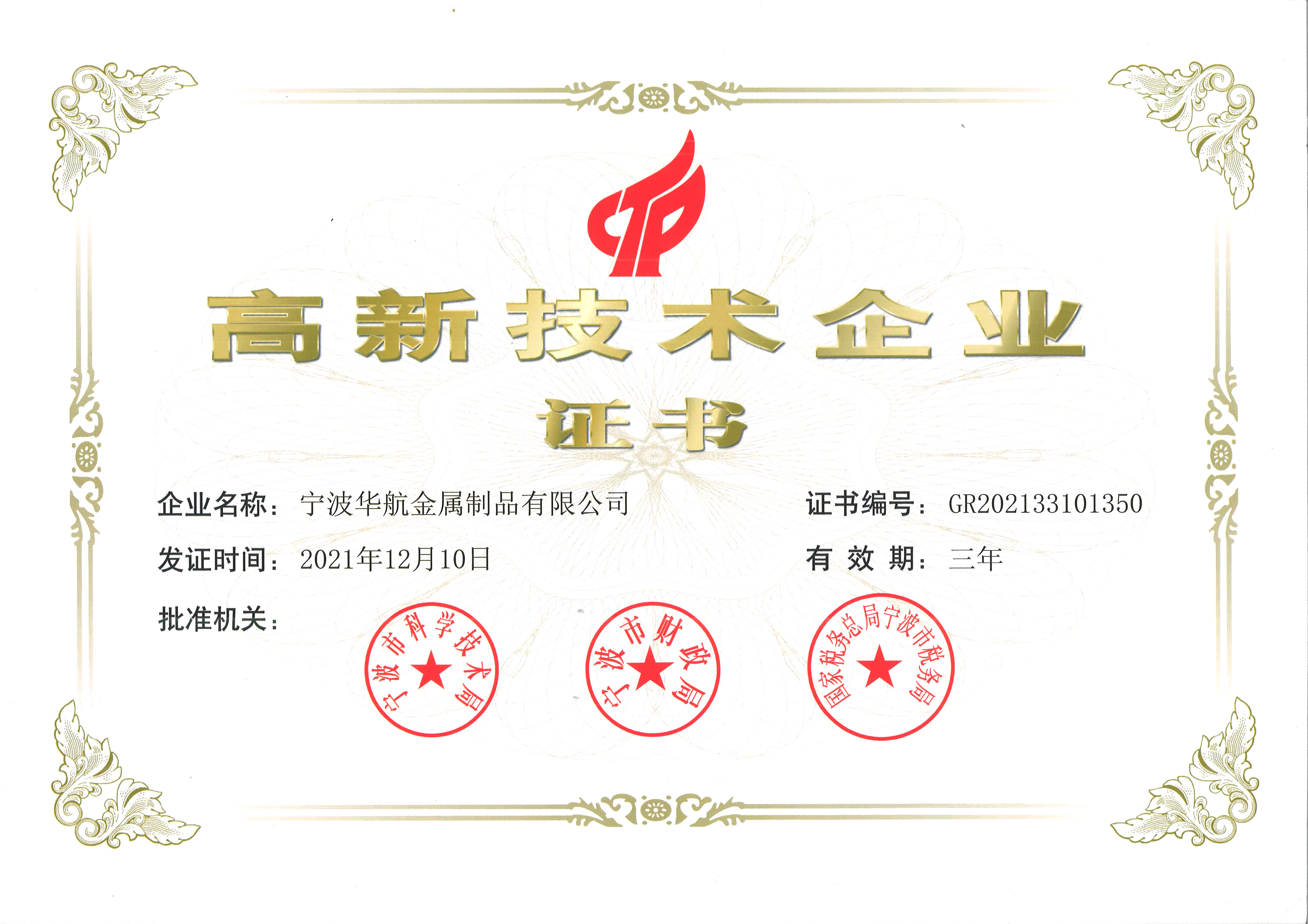 2021年12月10日,寧波華航金屬制品公司被認(rèn)定為國家“高新技術(shù)企業(yè)”。寧波華航堅(jiān)持走自主創(chuàng)新、持續(xù)創(chuàng)新的發(fā)展道路。其中公司擁有10多名的技術(shù)研發(fā)工程師,為公司在新品開發(fā),技術(shù)革新方面提供前驅(qū)保障